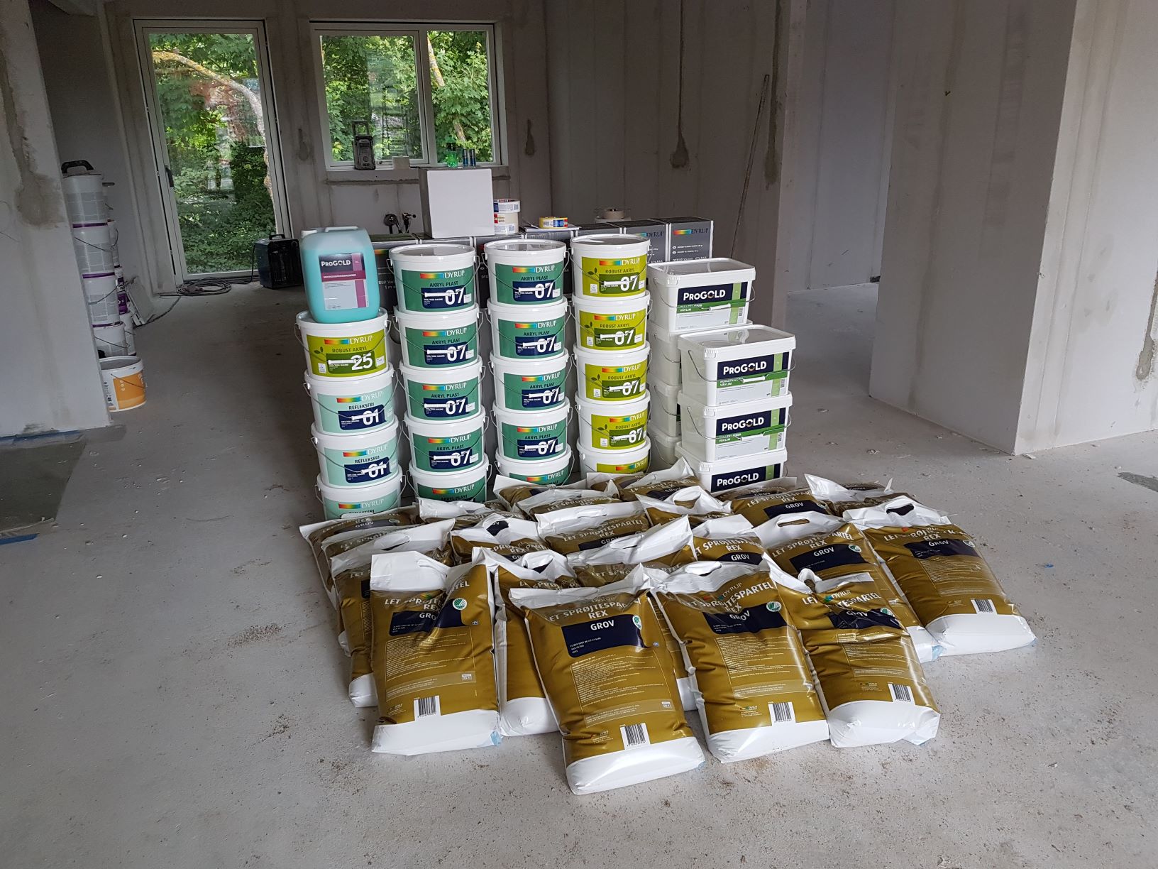 Vi havde aldrig set så meget spartelmasse, væv og maling før i vores liv! Her er det stillet op foran køkkenet, hvor spisebordet til sin tid skal stå.