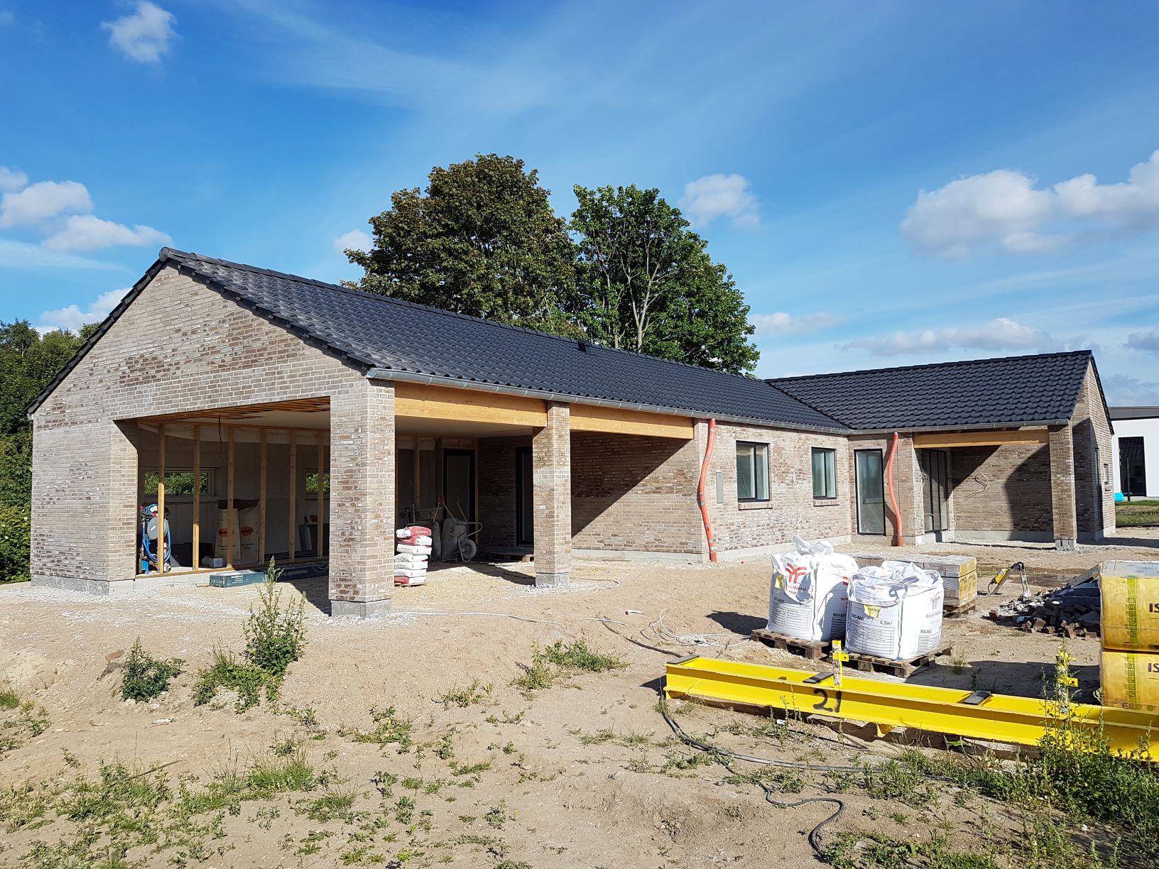 Nu er limtræsbjælkerne ved carport og terrasse malet, så huset er færdigt udefra, og der er ryddet næsten op med byggematerialer og emballage.